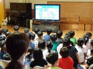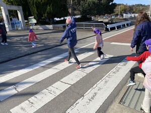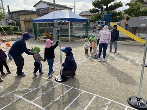 - 園庭に横断歩道や信号機を設置したコースを設けて歩いたり、腹話術や映像教材を活用して、楽しく分かりやすい交通安全教育を進めています。