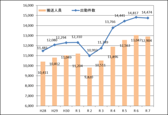 徳島市の令和7年の救急車による出動件数は、14,747件でした。これは1日あたり約40件出動したことになります。