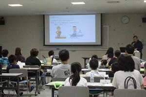 その後、「市場紹介動画」を視聴し、「市場で働く人のお話」と題しまして、青果部卸売業者社員による講義を行いました。