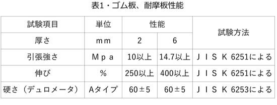 ゴム板、耐摩板はブタジエンゴムとし、性能は表1のとおりとする。