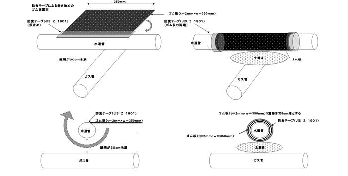 サンドエロージョン対策は次頁図1のとおりとし、原則として水道管にゴム板(ブタジエンゴム、厚さ2ミリメートル、幅350ミリメートル)を3重巻きし6ミリメートル の厚さとする。
