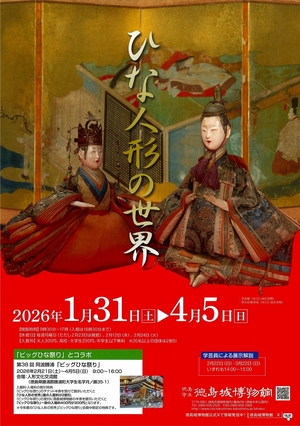 春の訪れとともに、3月3日の上巳の節句には雛人形を各家で飾り、華やかな雛祭りが行われます。節句行事として私たちに身近な年中行事となった雛祭り。そして家ごとに大切に守り伝えられてきた雛と雛道具の数々。こうした優美で心なごむ雛祭りと、雛人形の世界を紹介する恒例の本企画展では今年も「立雛」から「享保雛」、「有職雛」や「次郎左衛門雛」、そして「古今雛」などが顔を揃えます。さまざまな様式の変遷を通して、雛人形の歴史を振り返るとともに、徳島市民から当館に寄贈いただいた懐かしき「御殿飾り」「段飾り」なども展示いたします。うららかな春の1日、心なごむ日本の人形文化と伝統行事の世界をお楽しみください。
