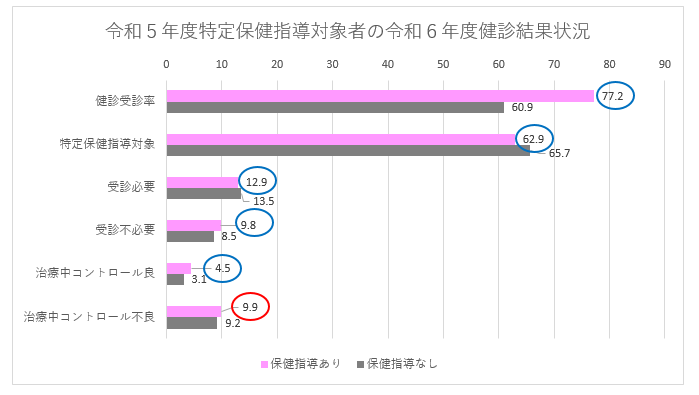 令和5年度特定保健指導対象者の令和6年度健診結果状況をみると、特定保健指導ありの方が、健診受診率が高くなっています。また、令和6年度も特定保健指導対象者になった割合は低く、受診不必要(異常なし)や治療中コントロール良(治療につながり適切にコントロールできている)が多くなっています。