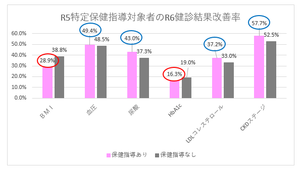 令和5年度の特定保健指導対象者の令和6年度の健診結果改善率をみると、特定保健指導を受けた方は血圧、尿酸、LDLコレステロール、CKDステージ(慢性腎臓病)の項目で改善率が高くなっています。BMI(体重)、HbA1c(糖尿病の指標)の改善率が低いことが課題です。
