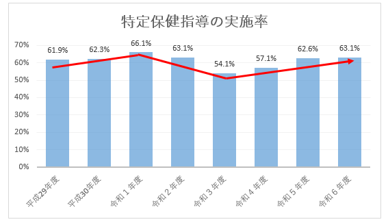 特定保健指導実施率は、新型コロナウィルス感染症の影響で令和2年度以降減少しましたが、令和4年度から再度増加しています。特定保健指導対象者に該当された方のうち、6割以上の方が保健指導を受けてくれています。