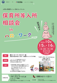 ハローワーク徳島マザーズコーナーとの共催により、お仕事探しと保育施設への入所相談が一度にできる相談会を開催します。