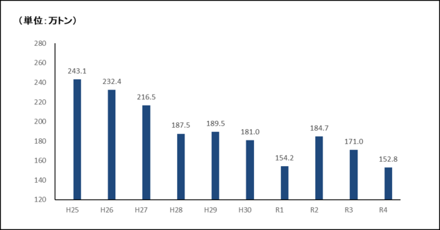 徳島市全域から排出される温室効果ガスについて、令和7年度に把握可能な直近の年である令和4年度の総排出量は152.8万トンで、市民一人あたりの年間排出量としては6.13トンです。