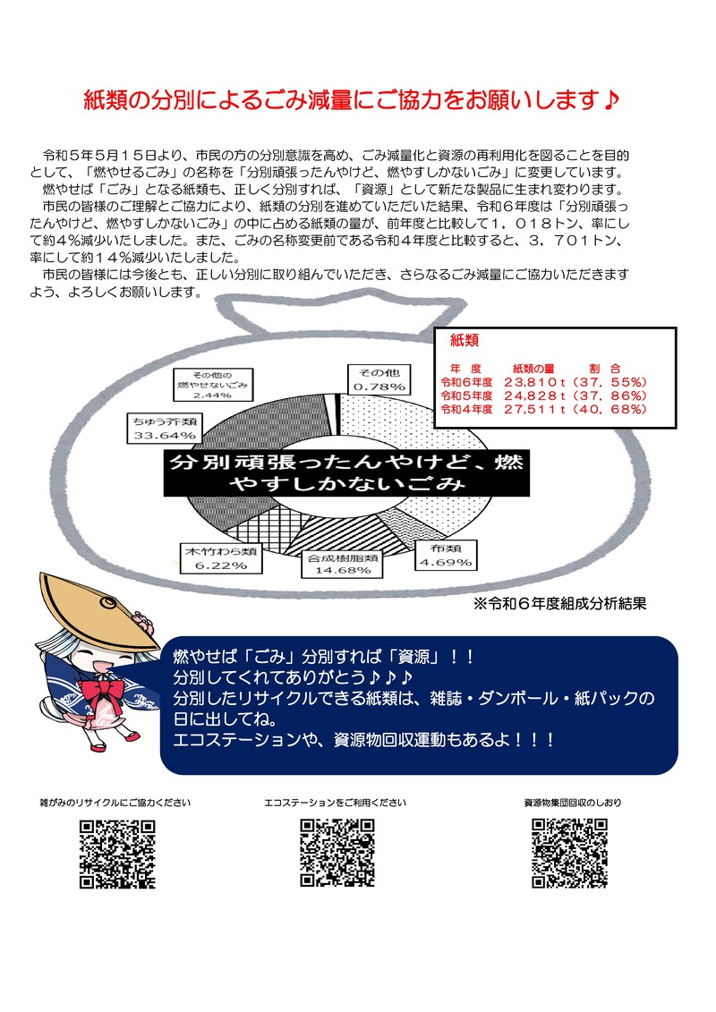 市民の方の分別意識を高め、ごみ減量化と資源の再利用化を図ることを目的として、「燃やせるごみ」の名称を「分別頑張ったんやけど、燃やすしかないごみ」に変更しました。