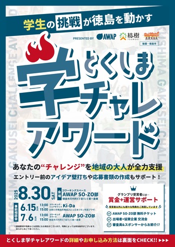 一般社団法人AWAP(外部サイト)が、クラウドファンディングプラットフォーム「For Good」で集めた寄附金と、一般財団法人村上財団からのマッチング寄附を原資に、「とくしま学チャレアワード」を開催しました。