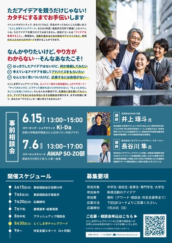 「とくしま学チャレアワード」は、徳島の学生が考えたまちづくり企画を発表する機会かつ支援者とのマッチングの機会として開催されました。まちづくり企画は審査され、グランプリの受賞者は、資金提供を含め、企画の実現までに必要な支援を受けることができます。