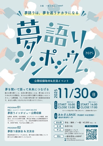 徳島市は、持続可能な地域づくりを推進していくため、市民活動団体などによる、まちづくり活動を支援しています。一般社団法人AWAPは、令和6年度の採択団体であり、フリーマガジンAWAPの発刊をはじめ、この度の「夢語りシンポジウム」の開催など、さまざまな活動を行っています。