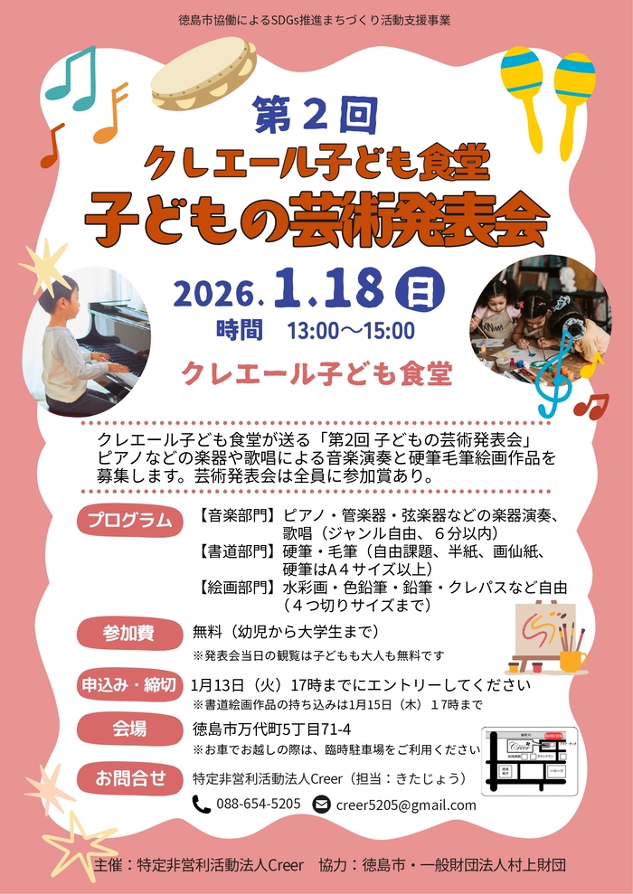 徳島市は、持続可能な地域づくりを推進していくため、市民活動団体などによる、まちづくり活動を支援しています。特定非営利活動法人Creerは、令和6年度の採択団体であり、子ども食堂及び子ども宅食をはじめ、この度の「第2回クレエール子ども食堂 子どもの芸術発表会」の開催など、さまざまな活動を行っています。