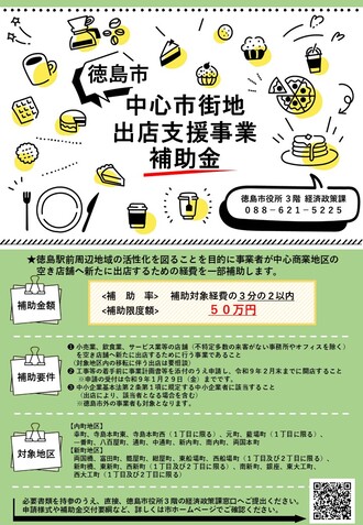 徳島市では、徳島駅前周辺地域の活性化を図ることを目的に、事業者が中心商業地区の空き店舗へ新たに出店するために要する経費の一部を補助します。