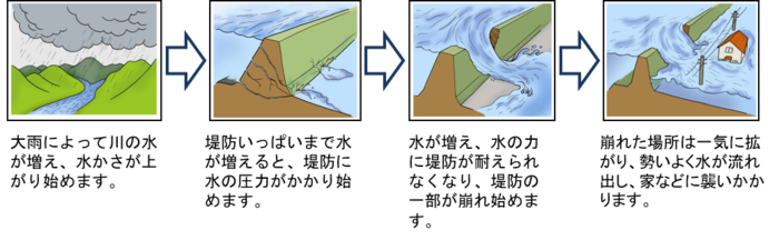 河川の堤防から水が溢れ又は破堤して、家屋や田畑が浸水することを外水氾濫と言います。外水氾濫が発生すると広い範囲が浸水して、大きな被害が発生する恐れがあるので特に注意が必要です。