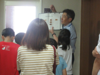 資料を使って部署が分かれていることや、いつでも救助に行けるように24時間体制で勤務にあたっていることなどを説明してもらってから、消防署の探検スタートです!!