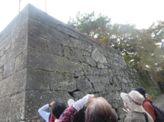 下乗橋を渡ると青石を積んで作られた石垣が見えます。よく観察すると石に「大」の字などが刻まれているとのことで、参加者の皆さまはじっくりと観察して、見つけてはお互いに教え合っていました。次に線路をまたぐ歩道橋の上から城を守る仕組みの「舌石」と呼ばれる支柱石を見ました。