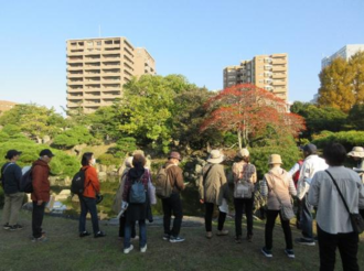 令和7年11月15日(土曜)第19回「図書館資料片手に街角散歩 徳島中央公園 ―お城と青石めぐり―」を開催しました。鷲の門を起点に、下乗橋→子供平和記念塔→旧徳島城表御殿庭園→バラ園というコースを巡りました。当日は快晴、紅葉も美しくまさに散歩日和となりました。
