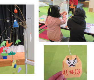 「家具かし弁天」は、八万町の寺山に伝わる、家具を貸し出す弁天さまのお話、「たぬきと大工さん」は、助任橋を渡る大工さんとたぬきのお話です。参加者の皆さまは、徳島が舞台の不思議なお話を楽しまれている様子でした。今回は紙芝居の他に、手歌(手話を使った歌)の「赤鼻のトナカイ」、うちわを使った「一寸法師」のお話やお正月かざりの工作もあり、参加者の皆さまは季節感のあるイベントを楽しまれていました。