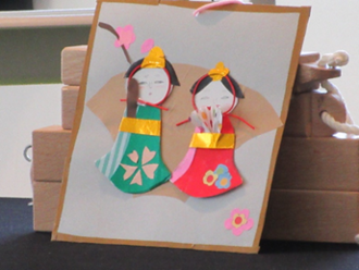 ひな人形の目と口を描いたり、シールを貼ったりしてそれぞれ素敵な作品を作っていました。