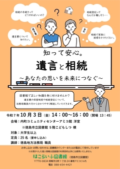 遺言書の保管制度や相続登記について、法務局職員のかたから分かりやすく解説していただきます。